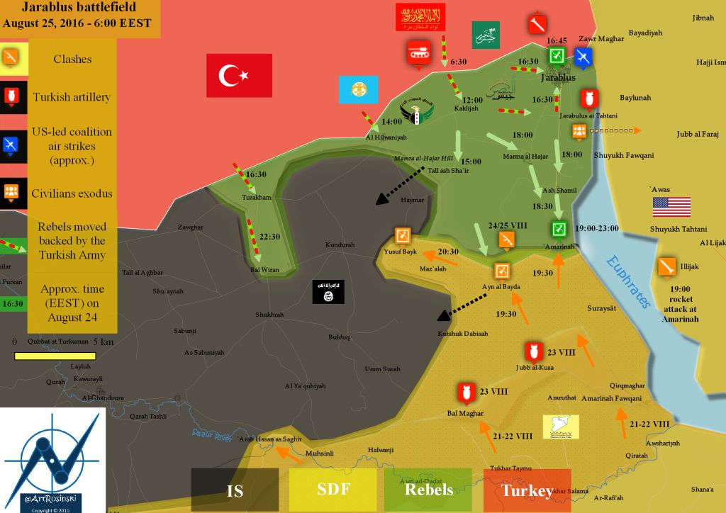 Войска Сирийского Курдистана контролируют север и северо-восток страны — три кантона: Джазира, Кобани, Африн. Именно курды планировали выбить ИГ из города Джараблус. Таким образом они бы перекрыли боевикам путь снабжения и взяли под контроль практически весь участок сирийско-турецкой границы. Но в дело вмешались Турция, и, судя по утверждению вице-президента США Байдена, сделанному им в Стокгольме, турки пришли в Сирию не на один день: «Турки готовы оставаться в Сирии столько, сколько потребуется для изгнания «Исламского государства».