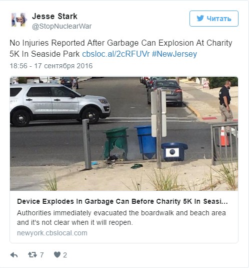 Самодельная бомба взорвалась перед стартом благотворительного марафона в Нью-Джерси в округе Нью-Йорка. Пострадавших в результате теракта не зафиксировано. Мероприятие в местном парке было отменено.