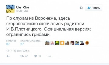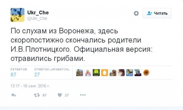 Жившие в Воронеже родители главы самопровозглашенной Луганской народной республики Игоря Плотницкого умерли от отравления грибами. Информация о смерти отца и матери лидера появилась в украинских соцсетях и СМИ 18 сентября. Однако официального подтверждения ей пока нет. Пользователи соцсетей успели заявить о том, что пенсионеров могла отравить «группа» из Киева из-за «отказа Плотницкого».
