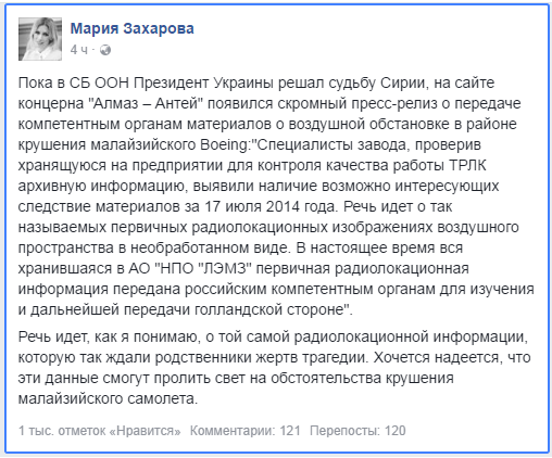 Официальный представитель МИД РФ Мария Захарова прокомментировала информацию о появлении подробностей в расследовании концерна «Алмаз-Антей», касающемся катастрофы Boeing 777. Она выразила надежду, что новые сведения помогут выяснить истинную причину крушения самолёта Malaysia Airlines.