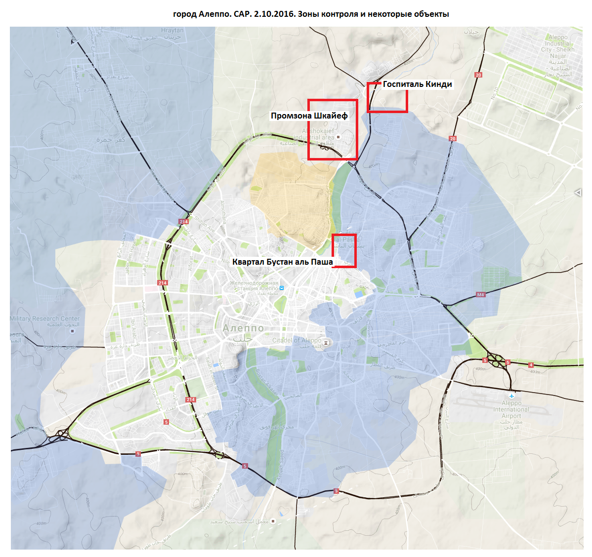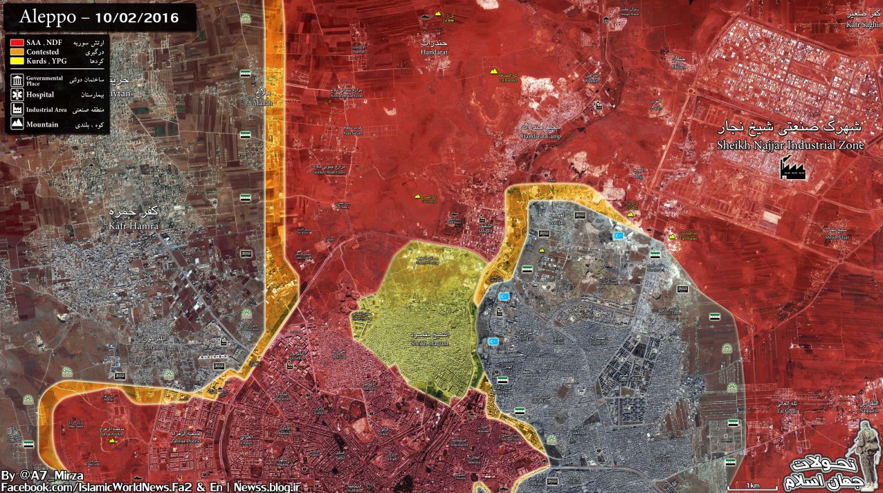 К 2 октября, САА, при поддержке "Лива-аль-Кудс" и курдов из квартала Шейх-Максуд, серьезно продвинулась на севере города. После занятия лагеря Хандарат и отбития контратак "Ан-Нусры" и "Нуреддин-ан-Зинки" на госпиталь Аль-Кинди, САА повела наступление на индустриальную зону Аль-Шакейф. Был установлен полный контроль на комплексом зданий к югу от трассы Кастелло (их некоторое время контролировали курды), а так же зачищена вся индустриальная зона Аль-Шакейф. Боевики отошли в квартал Аюн-Таль и индустриальную зону к западу от квартала. Новая линия обороны - квартал Аюн-Таль - Авиджа с центром позиции на господствующей высоте к северо-востоку от трассы. В ближайшие дни стоит ожидать попыток САА занять эту высоту, потеря которой практически наверняка вынудит постепенный отвод боевиками своих сил непосредственно в городские кварталы - Аюн-Таль и Хайдария, где будет проходить следующая линия обороны и армии будет сложнее реализовывать свое преимущество в артиллерии и бронетехнике.