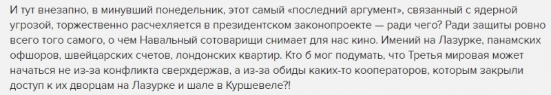Интернет-деятель, как он сам себя называет, якобы прочитал законопроект и усмотрел в нём попытку коррупционеров защитить свою собственность методом ядерного шантажа.