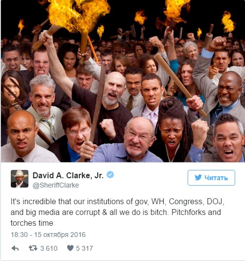 «Невероятно, все наши институты — правительство, Белый дом, конгресс, минюст и крупные средства массовой информации — коррумпированы. А всё, что делаем мы, — брюзжим. Пришло время вил и факелов», — написал Дэвид Кларк в своем микроблоге.