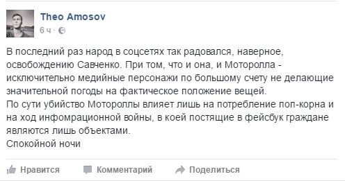 Однако убийство Моторолы буквально «взорвало» соцсети. Украинские пользователи не скрывают своей радости, сравнивая это только с освобождением Надежды Савченко.