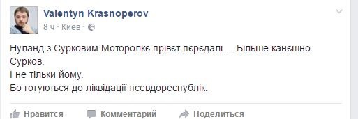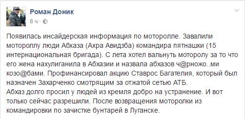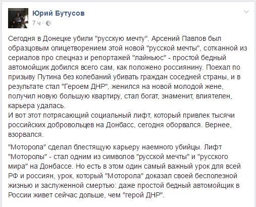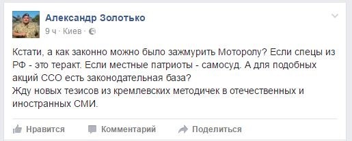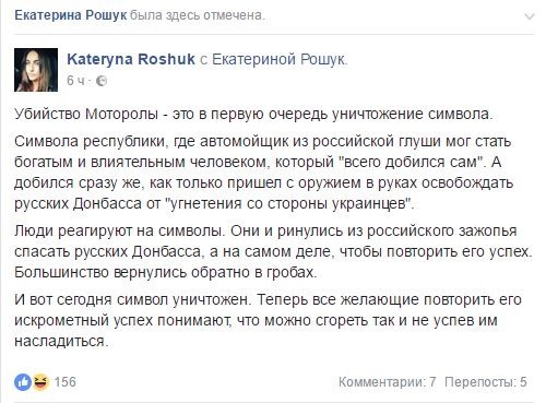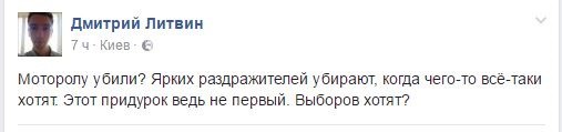 В «европейском» Facebook, в который ушли пользователи из «ФСБ-шного и москальского Вконтакте», люди, не стесняясь выражений, высказывают свои предположения касательно того, кто же именно стал заказчиком убийства Моторолы. Как ни странно, в очередной раз украинцы видят только «руку Москвы», «одобрение Кремля» и происки ФСБ.