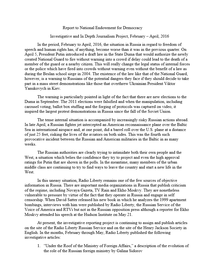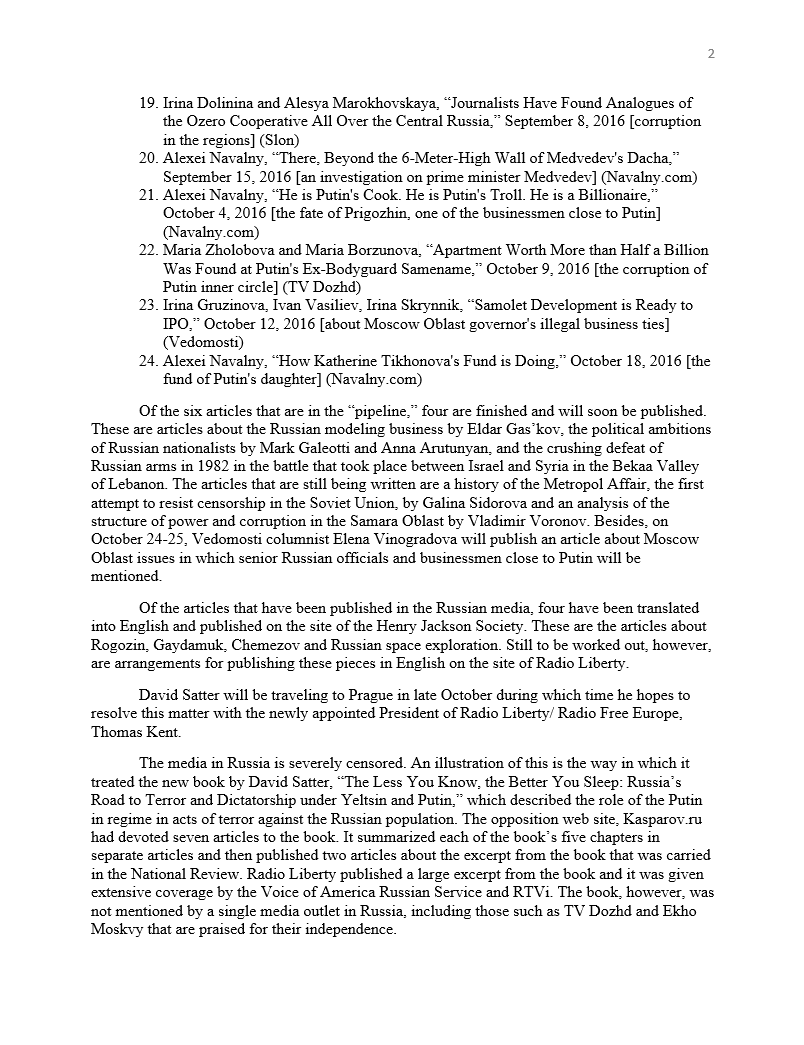 Только за первые десять месяцев 2016 года по заказу г-на Сэттера было подготовлено 24 статьи и журналистских расследований в таких СМИ, как РБК, «Ведомости» и «Радио Свобода». Например, материал Сергея Диброва «Черный день в истории Одессы», который оскорбляет память людей, погибших в Доме Профсоюзов. Еще шесть статей находятся в процессе редактирования либо готовы к публикации.