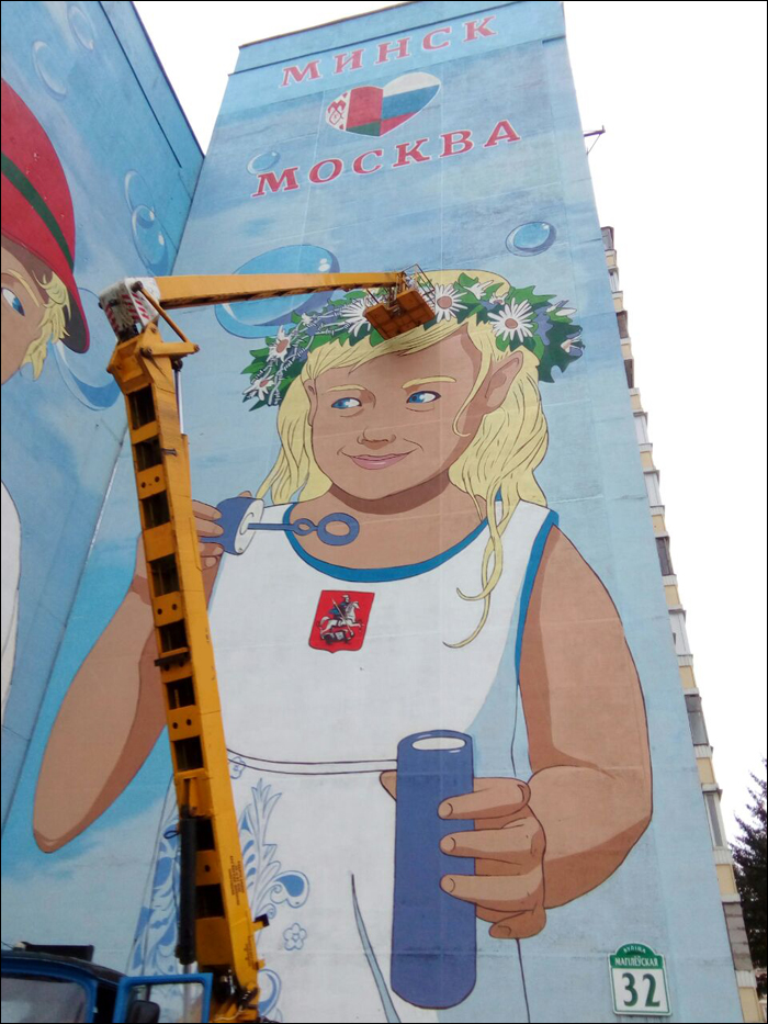 Граффити, символизирующие дружбу белорусской и российской столиц, было создано в подарок Минску ко Дням Москвы — по инициативе представительства столицы России. Работу выполнил ярославский художник Артур Кошак. Источник