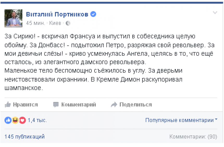 Стоит отметить, что профессия журналиста обязывает человека говорить правду, основываясь на неоспоримых фактах, а также нести ответственность за свои слова. Владимира Портникова сложно назвать представителем СМИ, ему скорее подойдет роль сказочника-выдумщика с ярко выраженной ненавистью к России. Не так давно его больная фантазия натолкнула к написанию экспромта про то, как Олланд, Порошенко и Меркель убивали Владимира Путина. Если это можно назвать журналистикой, то у украинских систем массовой информации нет шансов на выживание.