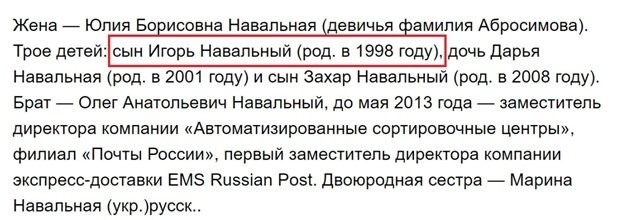 Но вот в Вики-проекте Олега Макаренко (блогер Фриц Морген) Ру-Эксперт, в статье про Алексея Навального мельком упомянут сын Игорь 1998-го года рождения.