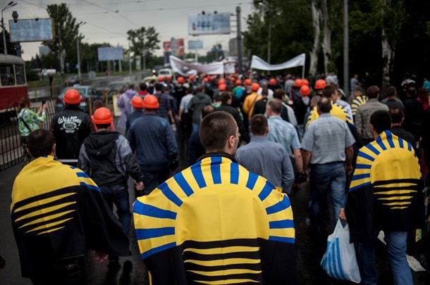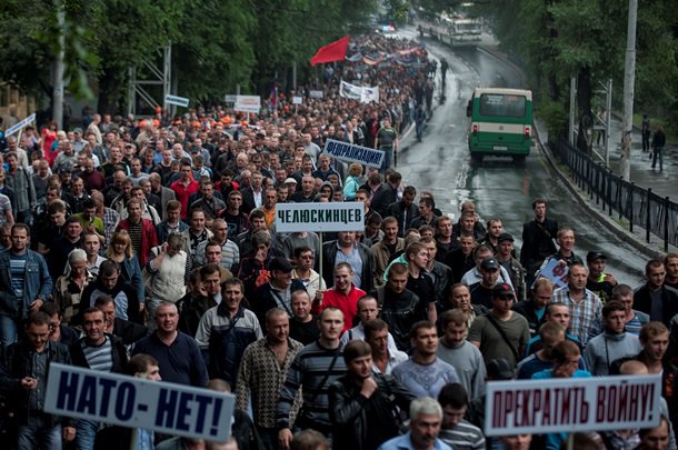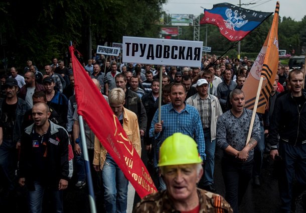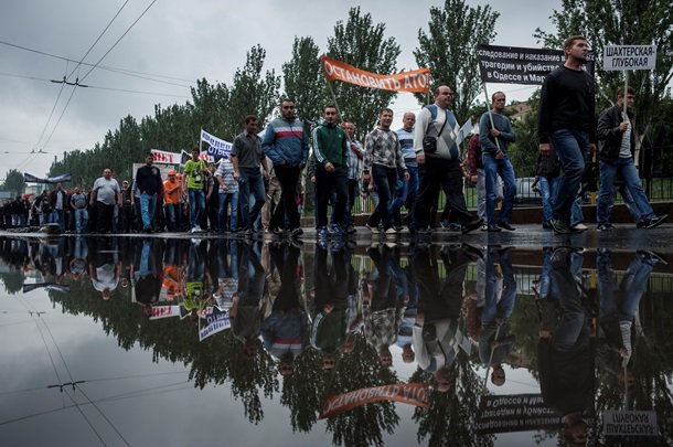 По улицам Донецка прошла колонна из нескольких сотен демонстрантов. По утверждению очевидцев, это были шахтеры, протестующие против проведения АТО на Юго-Востоке.