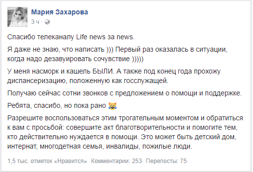 — Первый раз оказалась в ситуации, когда надо дезавуировать сочувствие ))))) У меня насморк и кашель БЫЛИ. А также под конец года прохожу диспансеризацию, положенную как госслужащей, — сообщила Захарова на своей странице в "Фейсбуке".