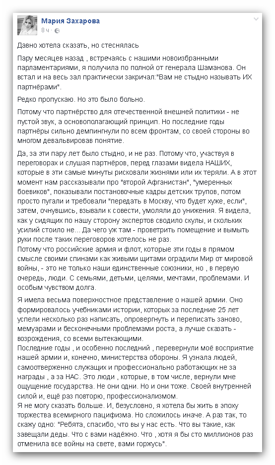 «Я хотела бы жить в эпоху торжества всемирного пацифизма. Но сложилось иначе. А раз так, то скажу одно: "Ребята, спасибо, что вы у нас есть. Что вы такие, как завещали деды. Что с вами надежно. Что, хотя я сто миллионов раз отменила бы все войны на свете, вами горжусь», – резюмировала официальный представитель МИД РФ.