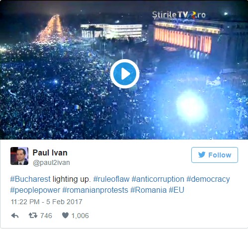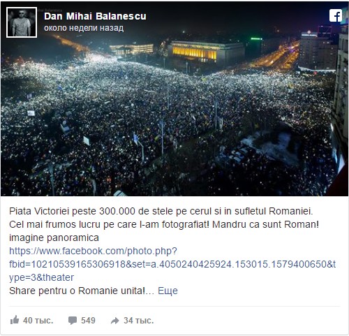На прошлой неделе в протесте приняло участие около 250 000 человек, что сделало его самым масштабным собранием со времен краха коммунизма в 1989 году. Но в воскресенье толпа выросла вдвое – протесты проходят по всей стране, и сотни тысяч протестующих собрались на площади Победы в Бухаресте.