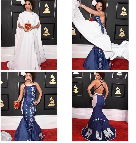 Если вы никогда не слышали о певице по имени Джой Вилла, то самое время заполнить этот пробел. На Amazon до недавнего времени было продано около 520 тысяч копий её последнего альбома “I Make the Static”, до тех пор пока на церемонии награждения Грэмми она не появилась в сине-белом платье с надписью “Make America Great Again” и буквами “TRUMP” вдоль подола (см.фото).
