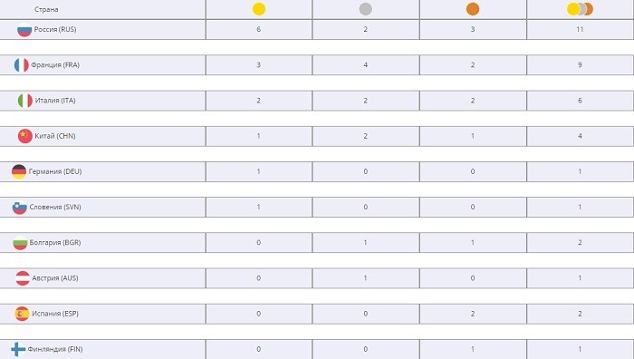 В самом начале Всемирных военных игр спортсмены сборной России продемонстрировали высший класс, сходу взлетев на первую строчку в медальном зачете с 11 наградами. С отставанием в две медали идут французы. Затем Италия и Китая с шестью и четырьмя медалями, соответственно.