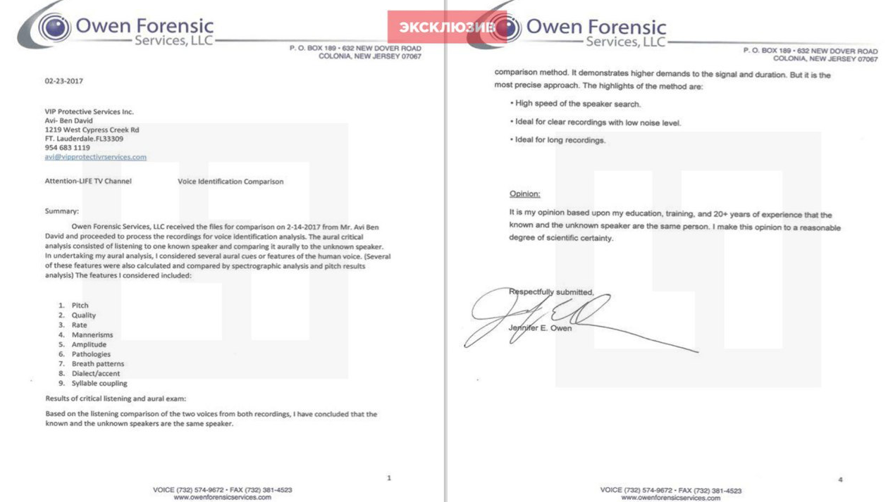 — В ходе проведения моего акустического анализа я рассмотрела несколько звуковых сигналов, или особенностей человеческого голоса. Некоторые из этих особенностей были также рассчитаны и сравнены путём спектрографического анализа и частотного анализа голосов, были исследованы спектрографические, слуховые, тоновые и словесные особенности голоса. Моё мнение, основанное на моём образовании, обучении и более чем двадцати годах опыта, заключается в том, что известный и неизвестный спикеры (голоса на записях) являются одним и тем же человеком, — говорится в отчёте Дженнифер Э. Оуэн.