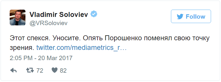 В своем твиттере Соловьев написал: «Этот спекся. Уносите. Опять Порошенко поменял свою точку зрения».