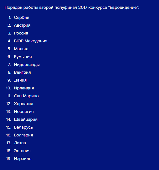 Второй полуфинал Евровидения состоится 11 мая. Вместе с Россией в списке на этот день значатся Сербия, Австрия, Македония, Мальта, Румыния, Нидерланды, Венгрия и еще 11 стран.