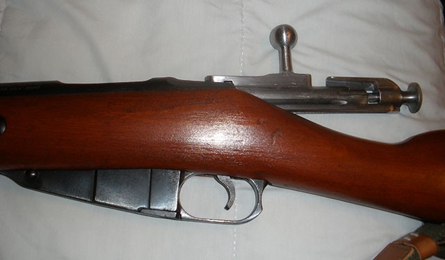 А вот тут восседающий на тренажере боец держит в руках известнейшую винтовку Мосина – причем интересно, что судя по загнутой рукояти затвора, довольно редкую снайперскую модификацию. Также бросается в глаза нелепо задранный кронштейн оптики. Очевидно, кустарного производства.