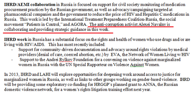Кроме этого, в биографии Навального есть еще один интересный момент, связанный с наркотиками. В 2015 году в Сети появились тысячи документов Института «Открытое общество» и одноименного фонда (Open Society Institute и Open Society Foundations). Они пролили свет на работу идеолога «цветных революций» Сороса. В двух документах фигурирует фамилия Навального в качестве лоббиста и куратора программ “PHP work in Russia” и “Capacity building and strengthening the third sector”.