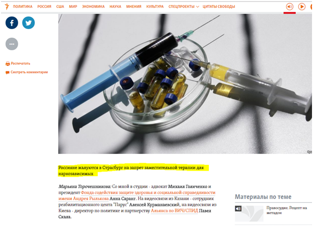 Стоит также добавить, что такие издания как «Голос Америки», «Радио Свобода» и другие либеральные СМИ в настоящий момент активно освещают тему «заместительной терапии» с использованием метадона. Экспертами в этих СМИ выступают исключительно сотрудники фондов, финансируемых тем же «Открытым обществом» Сороса.