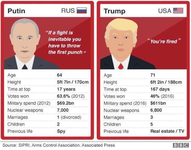 В ВВС даже сделали инфографику, в которой российский лидер Владимир Путин и американец Дональд Трамп изображены, как будто боксеры-номинанты на самый титулованный пояс.
