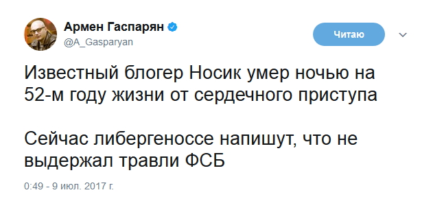 Смерть наступила в районе двух часов ночи. По предварительным данным, у Носика произошел сердечный приступ.