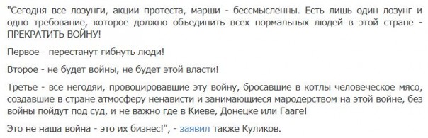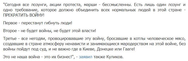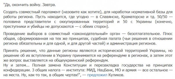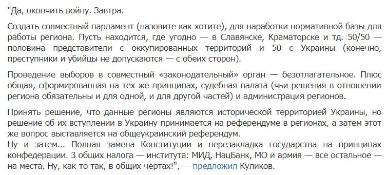 Куликов таким образом увидел возможность сохранить границы Украины в нынешних очертаниях. Помимо этого, Куликов уверен в том, что первоочередным должно стать прекращение братоубийственной войны, а все те, кто способствовал и популяризировал АТО, включая Порошенко и всю его действующую власть, должны быть отданы под суд или в Киеве, или в Донецке, а лучше — в Гааге.