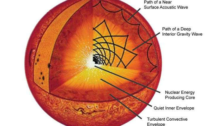 Рассчитав на основе этого взаимодействия силу и периодичность гидродинамических гравитационных волн, исследователи получили необычный результат — скорость вращения ядра вчетверо превысила скорость вращения поверхности. То есть если видимая часть Солнца заканчивает один цикл вращения вокруг оси примерно за месяц, то внутренняя — лишь за неделю.