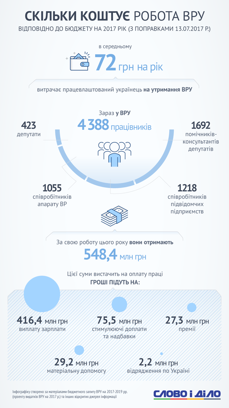 Известно, что Верховной Раде было выделено 548,4 млн. гривен в качестве зарплатного фонда. Общий бюджет рассчитан: на выделение зарплат нардепам в этом году – 416,4 млн. гривен; также предусмотрена сумма в 75 млн. в качестве надбавок и других возможных поощрений; 29,2 млн. гривен – в качестве материальной поддержки; 27,3 млн. идут как премиальные; 2,2 млн. рассчитаны на командировки по территории страны. По данным, представленным правительством Незалежной, на содержание одного народного депутата выделятся сумма в 80 тыс. гривен в месяц.