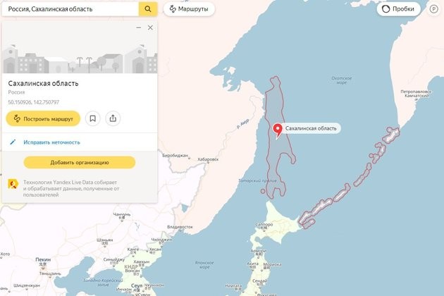 После запуска ракеты в КНДР из сервиса "Яндекс.Карты" исчез Сахалин