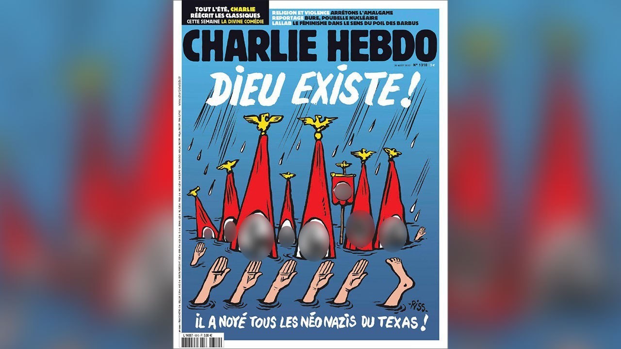 Новый номер французского сатирического еженедельника "Шарли эбдо" вышел с карикатурой на обложке, посвящённой наводнению в штате Техас. Подпись, сопровождающая рисунок, гласит: "Бог есть. Он утопил всех неонацистов Техаса".