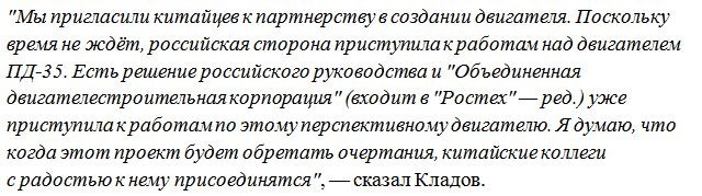 Также он добавил, что мотор нужен в первую очередь именно РФ, поэтому не так важно, будет ли кто-нибудь ещё принимать участие в разработке двигателя. В рамках проекта были приглашены китайцы, однако если это будет российско-китайский лайнер, работающий на американском моторе, то рассуждать о независимости с точки зрения техники подобных самолетов было бы излишне.