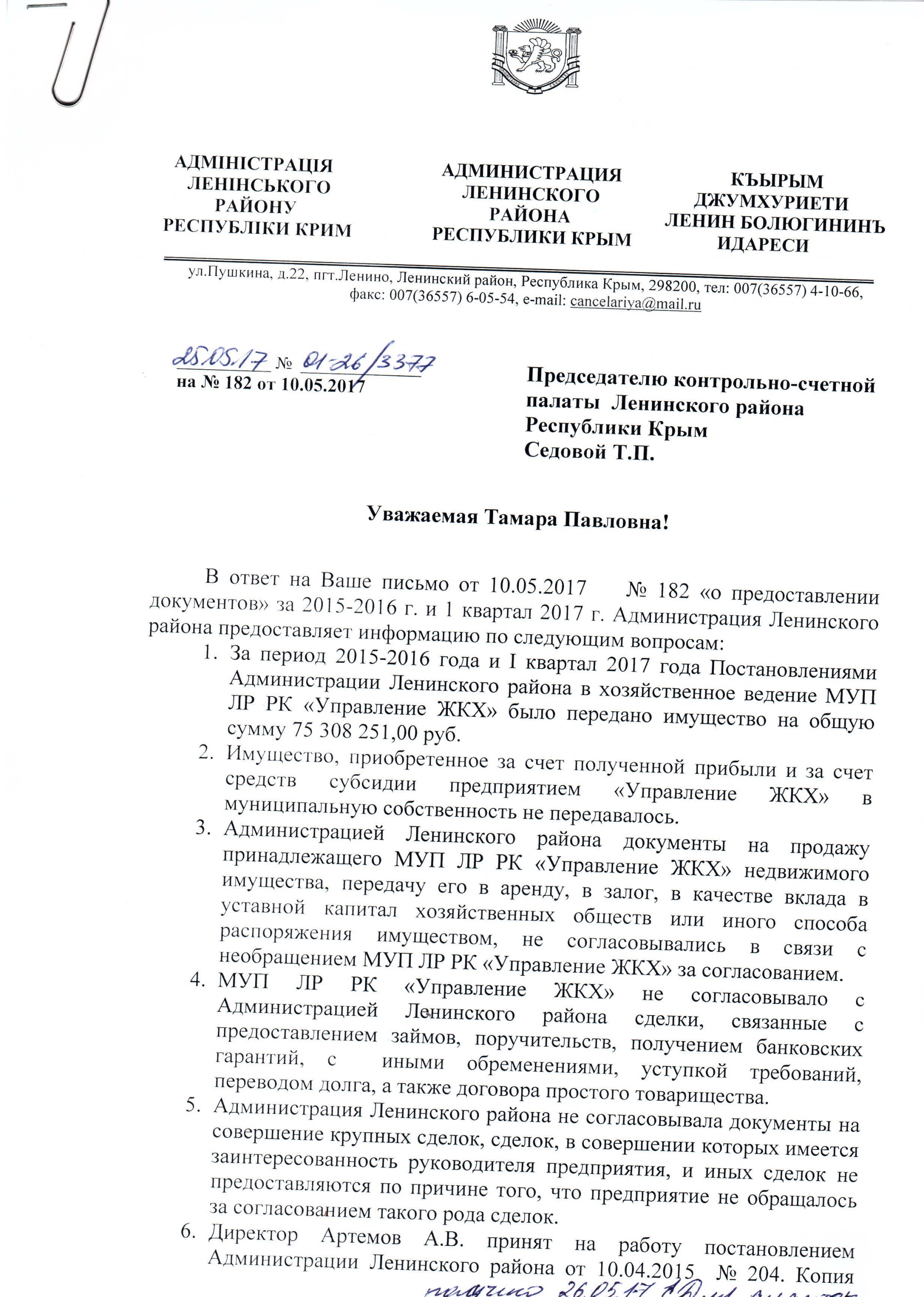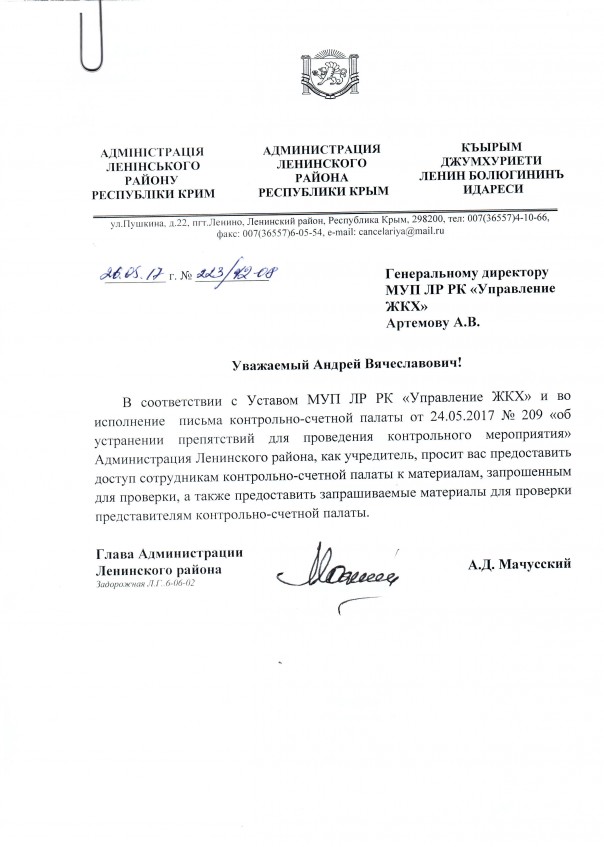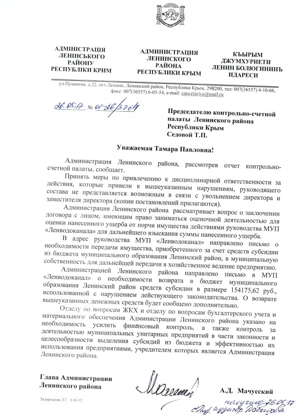 Администрации Ленинского района Республики Крым было поручено принять меры по закреплению принятого имущества на праве оперативного управления с оформлением акта приема-передачи. Как сообщают компетентные источники АКБ РК, государственная регистрация на право осуществления оперативного управления до сих пор не оформлена.