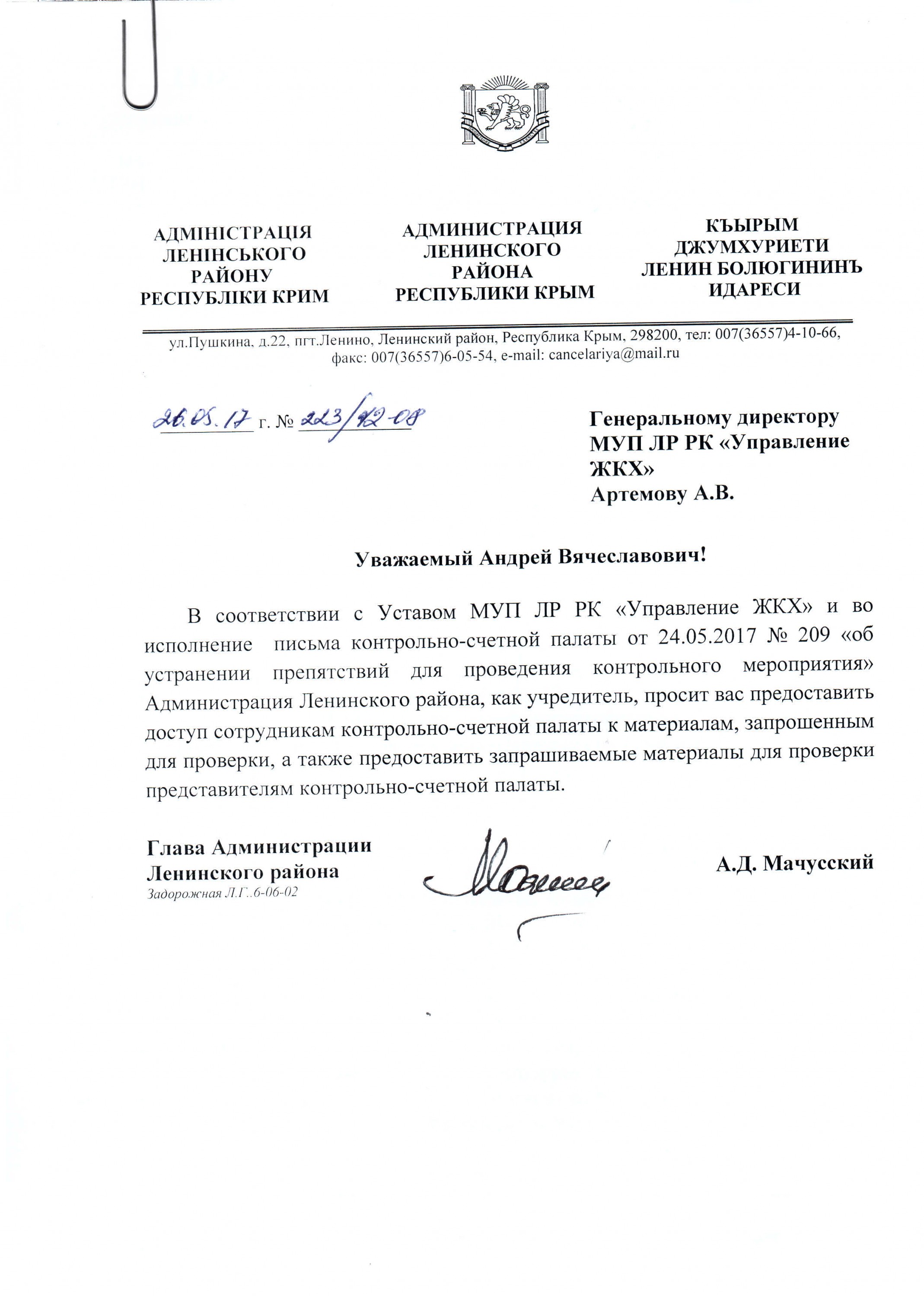 В свою очередь 27 января 2016 года глава администрации Ленинского района Александр Мачусский принял имущество в муниципальную собственность и закрепил его за МУП «Управление Агро-инвест» (МУП) на правах хозяйственного ведения. Руководителем предприятия был назначен Игорь Артемов. Ему предстояло поставить имущество на баланс и провести регистрацию права хозяйственного ведения в установленном законном порядке.