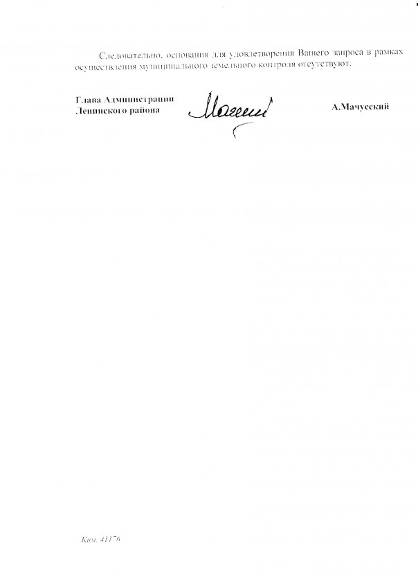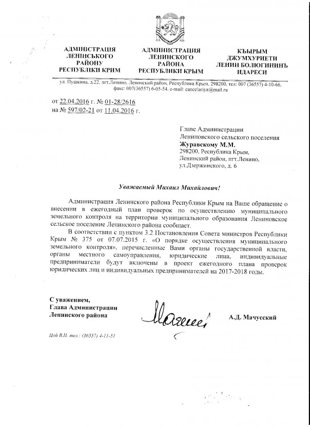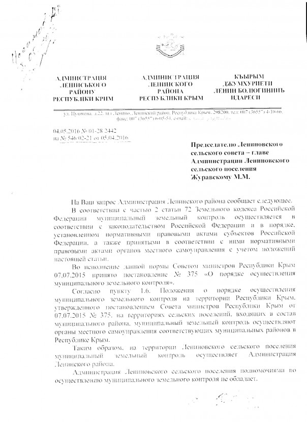 По данному поводу председатель Лениновского сельского совета Михаил Журавский обращался в прокуратуру и неоднократно направлял запросы главе Ленинской районной администрации о включении в план проведения муниципального земельного контроля деятельности субъектов предпринимательской деятельности, однако по состоянию на данный момент мер реагирования предпринято не было.