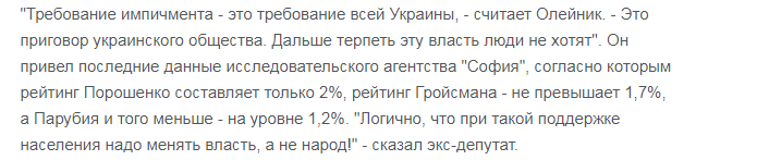 По мнению экс-депутата и члена комитета спасения Украины Владимира Олейника, требование импичмента — это требование всей страны, которая не хочет больше терпеть эту власть. В качестве аргументации он привел результаты последнего социального опроса среди украинцев, проведенного агентством «София» для определения степени лояльности к действующему режиму. Как показал соцопрос, всего 2% респондентов поддержали президента Украины Петра Порошенко, а рейтинг премьер-министра Гройсмана составил и того меньше — 1,7%.