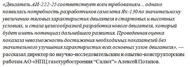 Как отмечает издание, в связи с появлением потребности создателей самолета Як-130 к увеличению тяговых характеристик мотора в стартовых и высотных условиях, была организована цель создать новый двигатель, который будет иметь перспективы для развития в будущем.