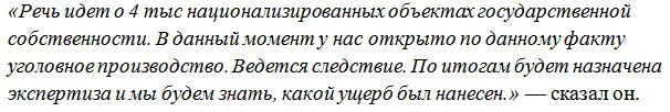 Так же «прокурор» считает, что в Крыму якобы имели место такие преступления, как присвоение частного имущества на сумму 1,5 млрд гривен. В итоге организацией, называющей себя «прокуратура Крыма», на всё это был наложен арест. Также открыто 17 уголовных производств.