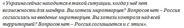 Теперь же, как считает Снегирёв, все условия будут диктоваться Россией и странами Европейского союза, а не украинским президентом Петром Порошенко.