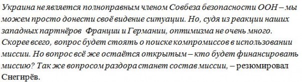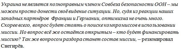 Кроме того, националист отметил, что Украина не является полноправным членом Совета безопасности ООН. Она может просто донести своё видение общего положения дел, но не более. Впрочем, если обратить внимание на партнёров в лице Франции и ФРГ, оптимизма это совсем не внушает. По мнению Снегирёва, вопрос заключается только в финансировании миротворческой миссии, который, вдобавок, также может стать «вопросом раздора».