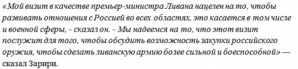 У российского оружия нашелся новый покупатель: председатель Совета министров Ливана Саад Харири во время своего визита в Россию планирует обсудить возможность закупки вооружений.