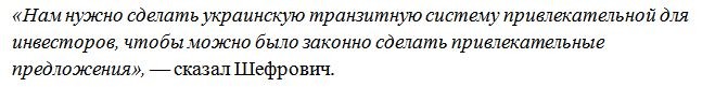Также Шефрович добавил, что ГС Украины необходимы инвестиции для модернизации. Лидер Еврокомиссии считает, что Европе нужно сделать украинскую систему более привлекательной для инвестиций в силу того, чтобы «привлекательные предложения» были законными.
