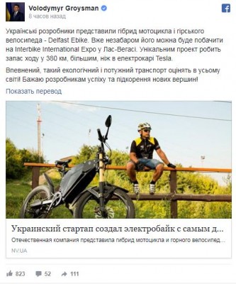 Премьер-министр Украины Владимир Гройсман сообщил, что украинские разработчики создали «уникальный проект» — гибрид мотоцикла и горного велосипеда. Уникальным изобретение делает то, что ходовой запас «мотоцикла-велосипеда» больше, чем у электрокара Tesla.