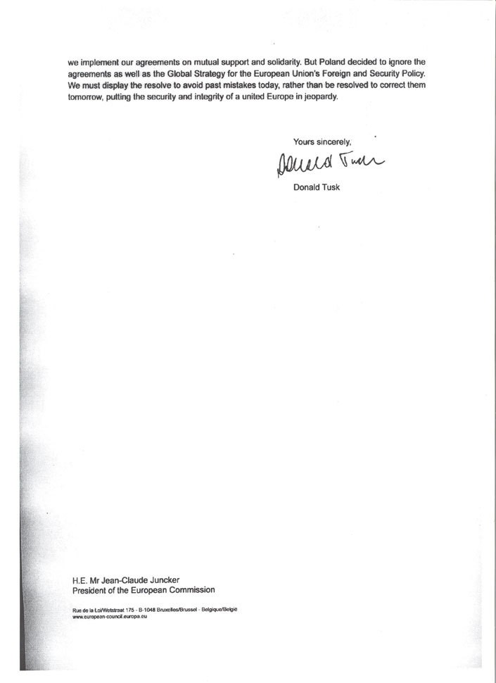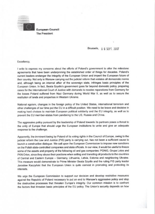 В своем письме председателю Европейской Комиссии Жан-Клоду Юнкеру президент Евросовета Дональд Туск выразил обеспокоенность попытками Варшавы изменить исторические договоренности и призвал Еврокомиссию разработать ограничительные меры в отношении правительства Республики Польша.