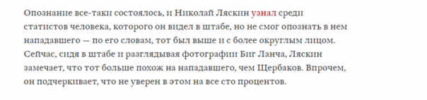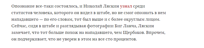 Но «Медиазона» в своем материале лишь подкрепила версию следствия, напомнив всем о недавнем нападении на одного из волонтёра Навального, который признал в Щербакове нападавшего, впрочем, тогда по голове никому ничем не досталось. А тот самый нововведённый в повестку «Биг Ланч» из неё не только выпадает, но и вообще никаким боком не вписывается.