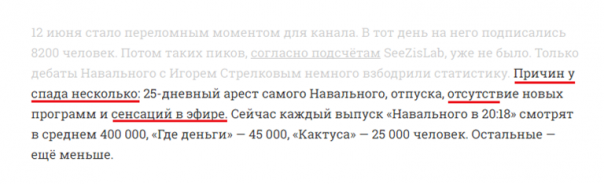 А если вам нужны мотивы Ляскина, побудившие его к заказу покушения на себя любимого, так тут всё совсем банально. В одной из посвящённых youtube-каналу Навального статей упоминалось о рекордно низкой активности пользователей в последнее время. Перед турне Алексея по России это был недопустимый сценарий.
