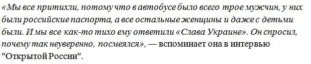 Девушка рассказала о своей поездке в Петербург в минувшем июле. Анна ехала автобусом по трассе через Киев, где были установлены самодельные блокпосты. На одном из таких «постов управления» в транспортное средство зашёл мужчина с автоматом. Воскликнув «слава Украине», он ожидал соответствующей реакции от пассажиров автобуса.
