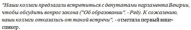 По её словам, на прошлой неделе большая делегация депутатов законодательного органа Украины была в Будапеште на форуме, который был организован Советом Европы относительно Стамбульской конвенции (Договор о предотвращении насилия в отношении женщин, подписанный в 2011 году). Геращенко заявила, что украинская сторона предложила парламентерам Венгрии провести встречу с целью обсуждения вопроса закона «Об образовании».