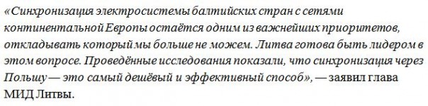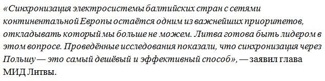 Следует отметить, Латвия и Эстония не торопятся выходить из системы с РФ. Это связано с дороговизной и несогласием с позицией Вильнюса, который, в свою очередь, настаивает на варианте соединения с сетями Европы через Польшу, а не Скандинавию. Таллин и Рига убеждены, что литовский вариант значительно дороже.